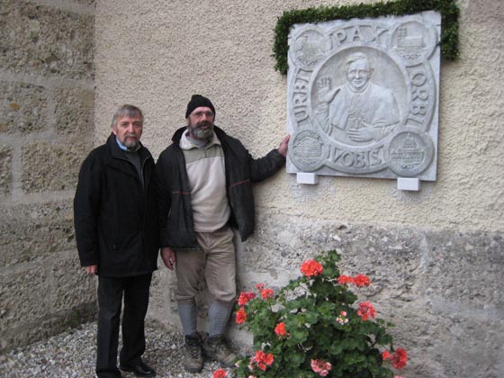 und Kurt Fischer vor dem Papstrelief an der Pfarrkirche in Palling