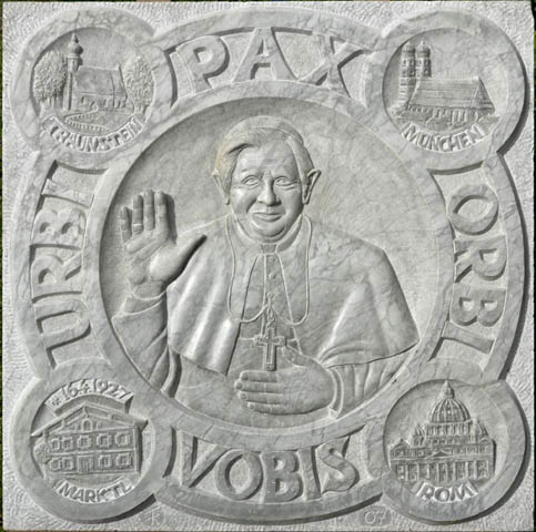 "Der Kreis des Lebens" Zum 80. Geburtstag von Papst Benedikt XXVI Carrara-Marmor 95x95 cm Es gibt auch ein Video zur Entstehung |