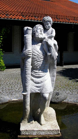 | "Bin ich dir zu schwer? Wir sind doch gleich drüben" Christopherus, weißer Marmor, Höhe ca. 200 cm Volksschule Palling |