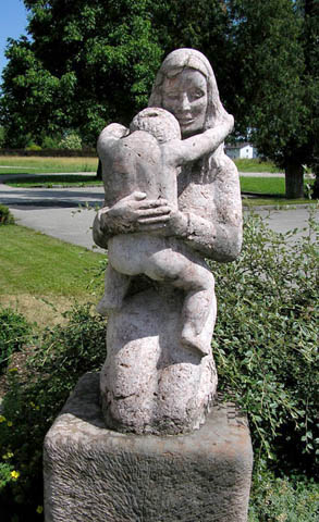 Mutter mit Kind vor dem Pallinger Rathaus Rötlicher Kalksteinfindling, Sockel Rosso Verona |